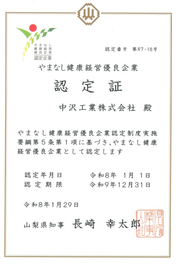 山梨県より健康経営優良企業認定を頂きました。社員一人ひとりが安心して働ける職場づくりをこれからも大切にしていきます。